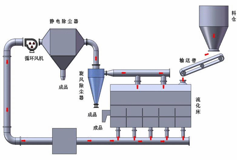 散粒狀的固體物料,由螺旋加料器加人流化床干燥器中。空氣由鼓風機送人燃燒室,加熱后送入流化床底部經分布板與固體物料接觸,形成流態化,達到氣固相的熱質交換,物料干燥后由排料口排出。尾氣由流化床頂部排出,經旋風分離器組回收。被帶出的產品,再經洗滌器和霧沫分離器后排空。
