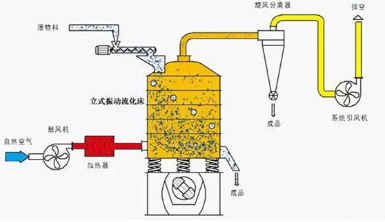 由安裝于主機下部的兩個振動電機同步反向回轉,使安裝于其上的多層環狀孔板組成的主機產生垂直振動與扭振,從而使由進料口進入的物料沿水平環狀孔板自上層向下層連續跳躍運動。熱空氣則自下層向上層通過各層孔板穿過物料層,達到物料均勻干燥目的。