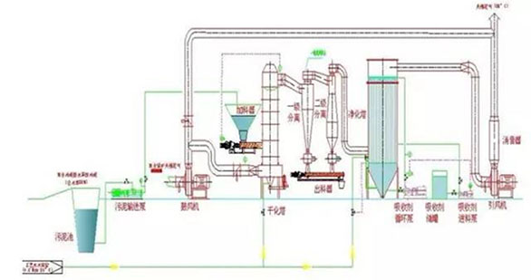 濕物料薄膜在熱載體的內部作用下和熱空氣外部作用下迅速完成干燥過程,然后在載體相互之間碰撞下變干的濕物料薄膜脫落并被粉碎。達到一定粒度后,隨干燥尾氣帶出干燥器,由系統后部的除塵設備收集。