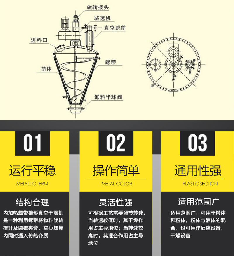 產(chǎn)品概述:內(nèi)加熱螺帶錐形真空干燥機是一種利用螺帶將物料旋轉(zhuǎn)提升及圓錐夾套、空心螺帶內(nèi)同時通入傳熱介質(zhì)(如熱水、導熱油、蒸汽等),使加熱后物料從四周提升并從中間下落,快速不斷的循環(huán)翻轉(zhuǎn),并通過筒體內(nèi)抽真空將水汽及時帶走