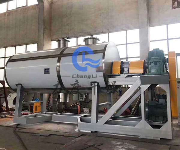 環(huán)氧樹脂從殼體上方投料口加入,在不斷轉(zhuǎn)動(dòng)的耙齒的攪拌下,物料與殼體壁接觸時(shí),表面不斷更新,被干燥物料受到蒸汽(或熱水、導(dǎo)熱油)間壁加熱,而使物料內(nèi)濕份汽化,汽化的濕份由真空泵及時(shí)抽走。